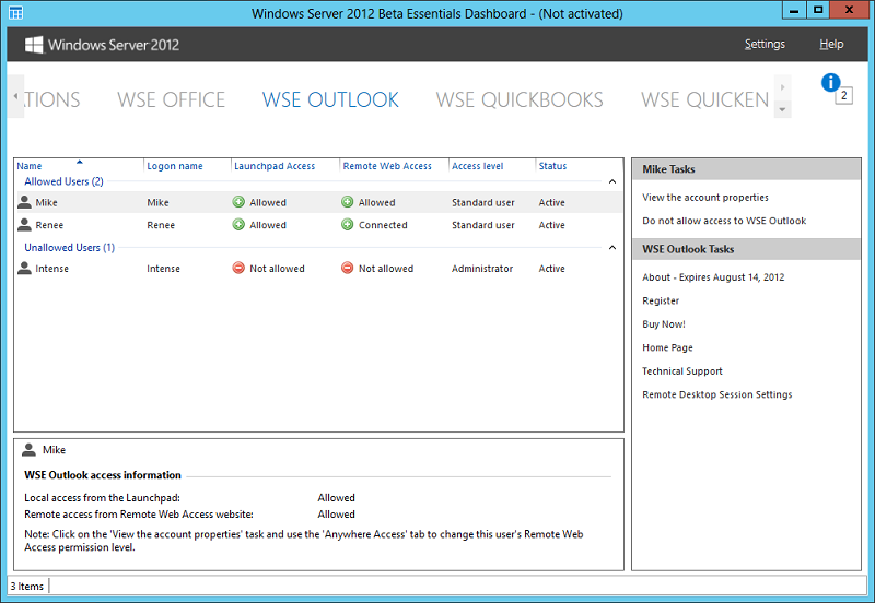 WSE Outlook 2012 is a Windows Server Solutions add-in for use with Windows Server 2012 Essentials. It provides individual user-level access to Microsoft Outlook from your server.